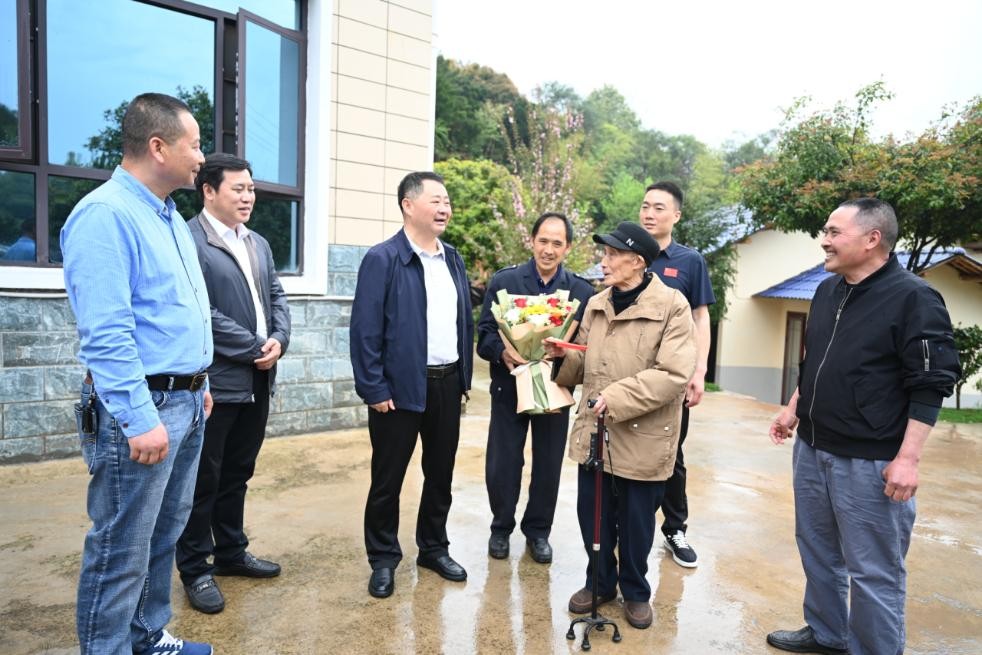屋外,春意盎然;屋内,暖意融融。黄国熙老人佩戴军功章,精神矍铄地端坐在椅子上,一众儿孙围绕膝前,欢声笑语不断,墙上大大的“福”字和“寿”字十分应景。刘新宇一行迎上前去,恭敬地给黄国熙老人献上鲜花和慰问金,并与黄老家人座谈交流,关切地询问其身体健康状况和家庭生活情况,详细了解一枚枚军功章背后的闪亮故事。