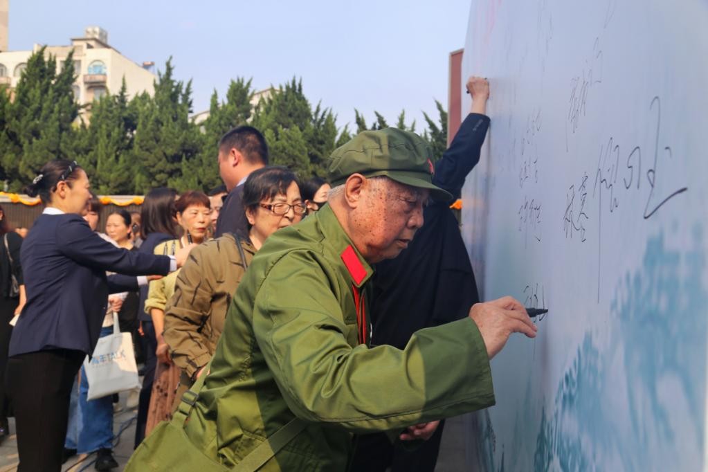 黑白碑墙,松柏环绕,尽显历史沉重。镌刻着11141个名字的英烈墙前,黄菊一字排开,侧耳犹闻枪炮声。一位身着军装的老者伫立在英烈墙前,凝重的脸上尽显哀思,而后又郑重地在签名墙上写下了自己的名字。