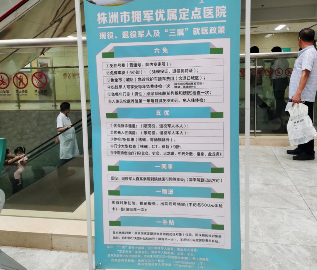株洲市三三一医院是一所集医疗、康复、科研、教学和预防保健于一体的三级综合医院,依托其医疗资源优势设立“株洲市拥军优属定点医院”后,现役军人、退役军人和其他优抚对象可在此享受“六免、五优、一同享、一赠送、一补贴”优待政策,不但可免挂号费、停车费、急诊接车费等费用,还享受优先就诊、入住、体检七折等待遇,重点优抚对象住院可享受自费部分500元补贴,优抚对象出院可领取500元体检卡,伤残军人可享受每年一次免费体检,现役军人、退役军人直系亲属可同等享受。医院还设置了退役军人专属病房,在此入住的老兵尹芸萼说道:“在这里很有亲切感,服务质量好,还比其他医院省钱,感谢党和政府对我们退役军人的关心。”
