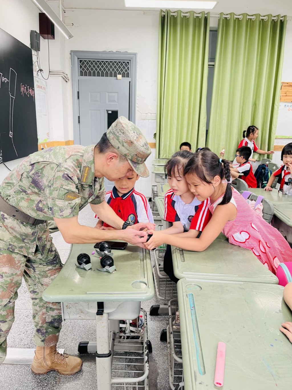 课上,市武装干部培训中心采取图文并茂的方式,给孩子们讲述了国防基础理论知识,展示了各式各样的武器装备和模型,并设置互动体验环节,让孩子们参与了手榴弹传递、模拟射击、防毒面具穿戴等军事技能的学习。“非常有趣,我长大了也要成为一名战士,保护我的国家!”孩子们在兴致盎然中学习了国防知识,培养了爱国热情,一颗爱国强军的种子在他们心中生根发芽。