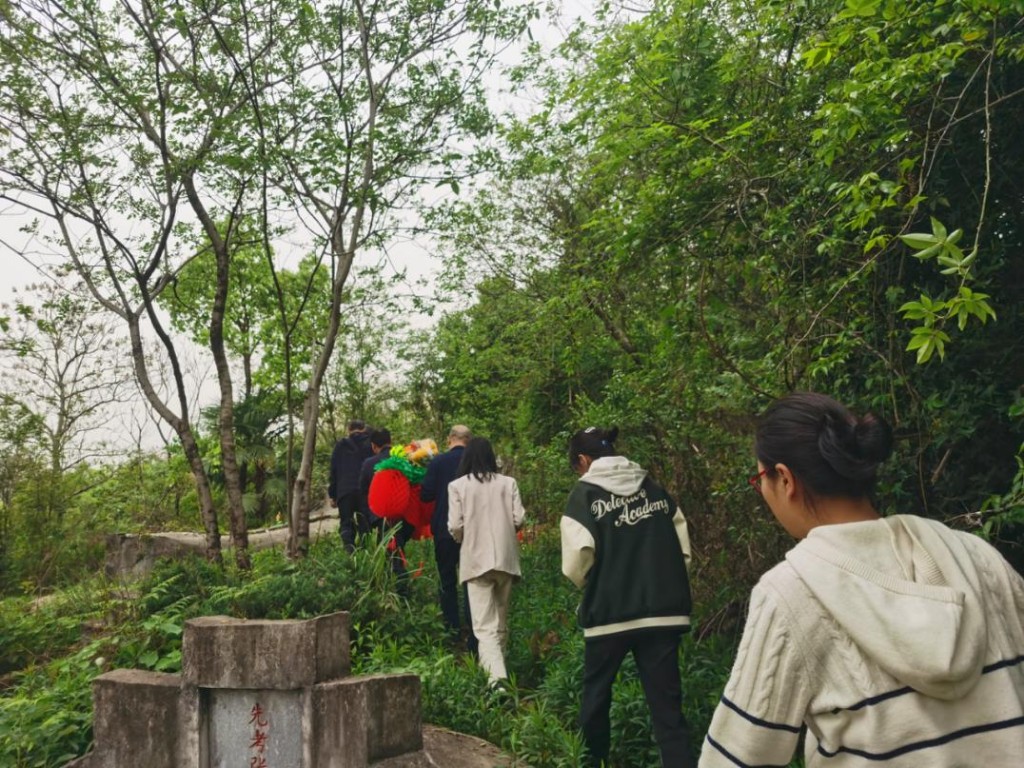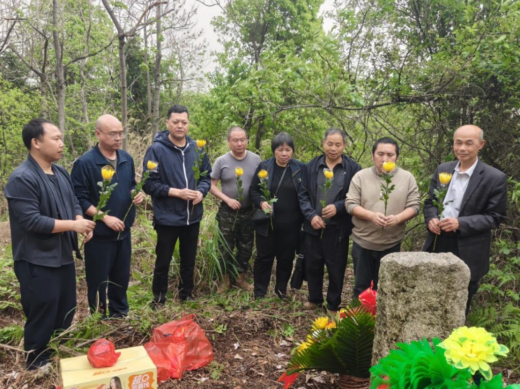 4月12日,祭扫当日上午还是狂风暴雨,下午天空格外晴朗,仿佛也在为这场缅怀仪式营造庄重的氛围。石峰区退役军人事务局、石峰区人武部、清水塘街道工作人员以及热心志愿者等10余人陪同烈属们,沿着蜿蜒崎岖、杂草丛生的山道缓缓步入位于山腰的烈士墓地。烈士墓前,全体人员庄严肃立,为烈士敬献鲜花与挽联,向烈士默哀致敬,行三鞠躬,寄托无尽的哀思。烈属们神情凝重,在墓前摆上了家乡的特产、点着了香烛,深情诉说着思念之情。陈文德烈士的侄子一边擦拭着墓碑,一边喃喃自语道:“叔叔,这么多年我们一直在找寻,今天终于如愿来看你了……”对亲人的思念与敬意倾注其中。