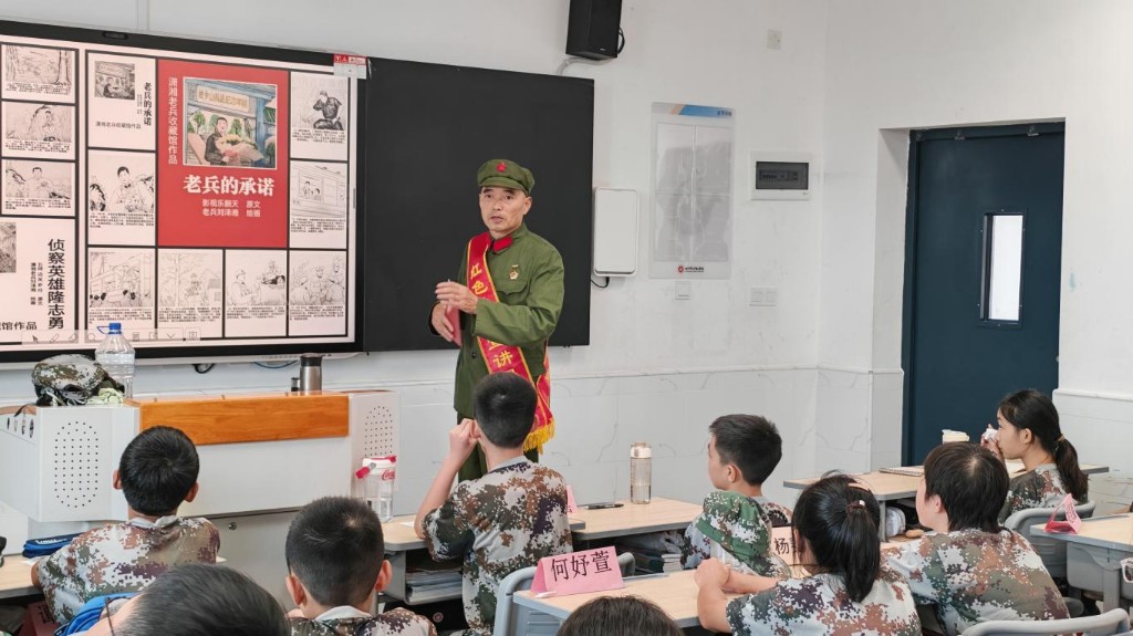 课堂上,身着笔挺军装、胸前勋章闪耀的刘泽湘刚一亮相,就赢得同学们的热烈掌声。他结合亲手创作的连环画和珍藏的老照片、军用水壶等实物,声情并茂地还原了当年的战斗场景:从接到命令时的义无反顾,到战场上与战友并肩冲锋的生死与共,再到如今坚守初心传承精神的执着。一个个鲜活的故事、一段段真挚的回忆,让同学们仿佛穿越时空,真切感受到了战争的残酷与先辈的无畏。“英雄不是遥远的传说,或许就在我们身边。”刘泽湘拿起一件军用品,语重心长地对同学们说:“今天的幸福生活来之不易,是无数先烈用热血换来的。希望你们铭记历史,把爱国奉献、奋勇拼搏的精神刻在心里,成长为有担当的新时代好少年。”