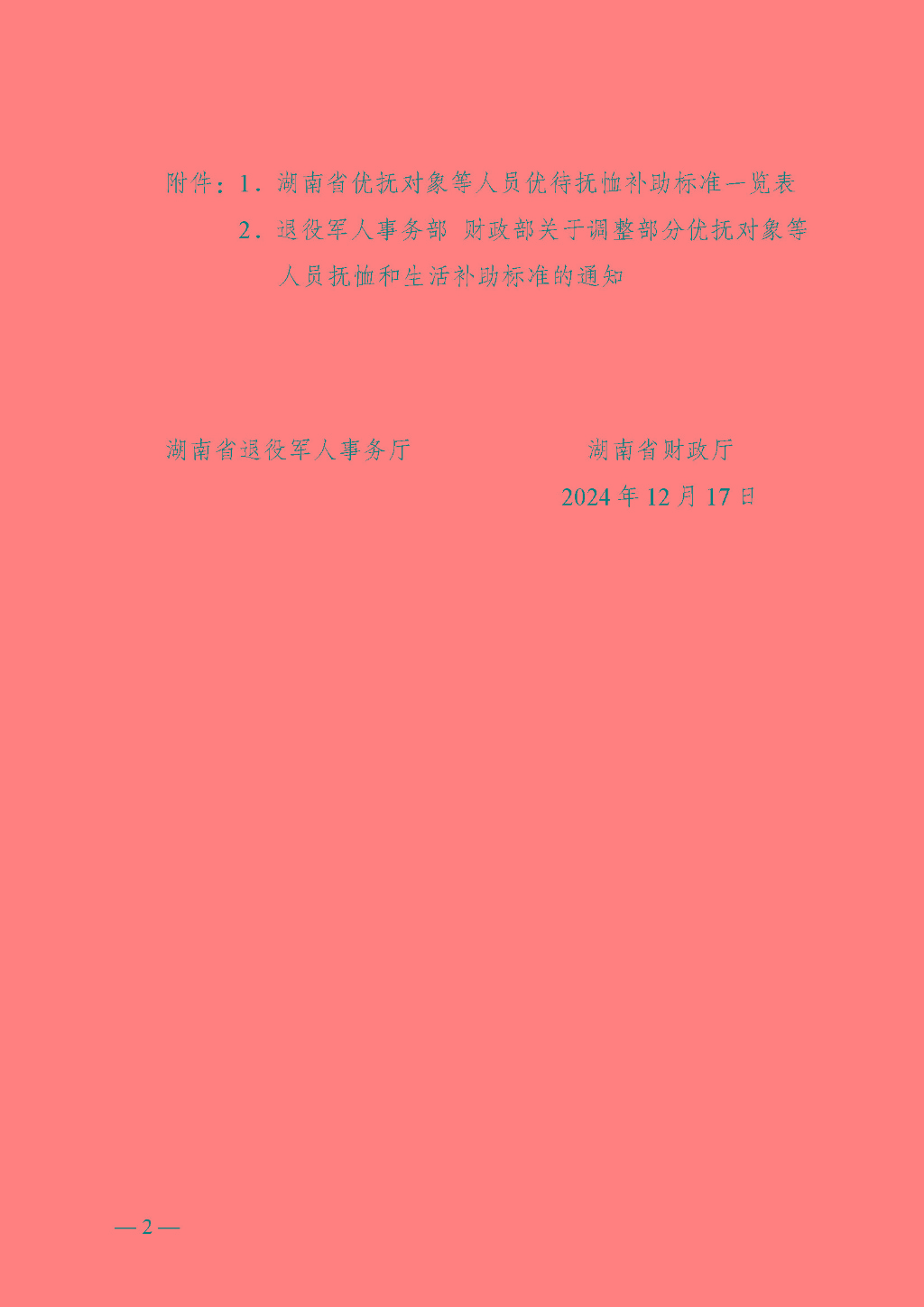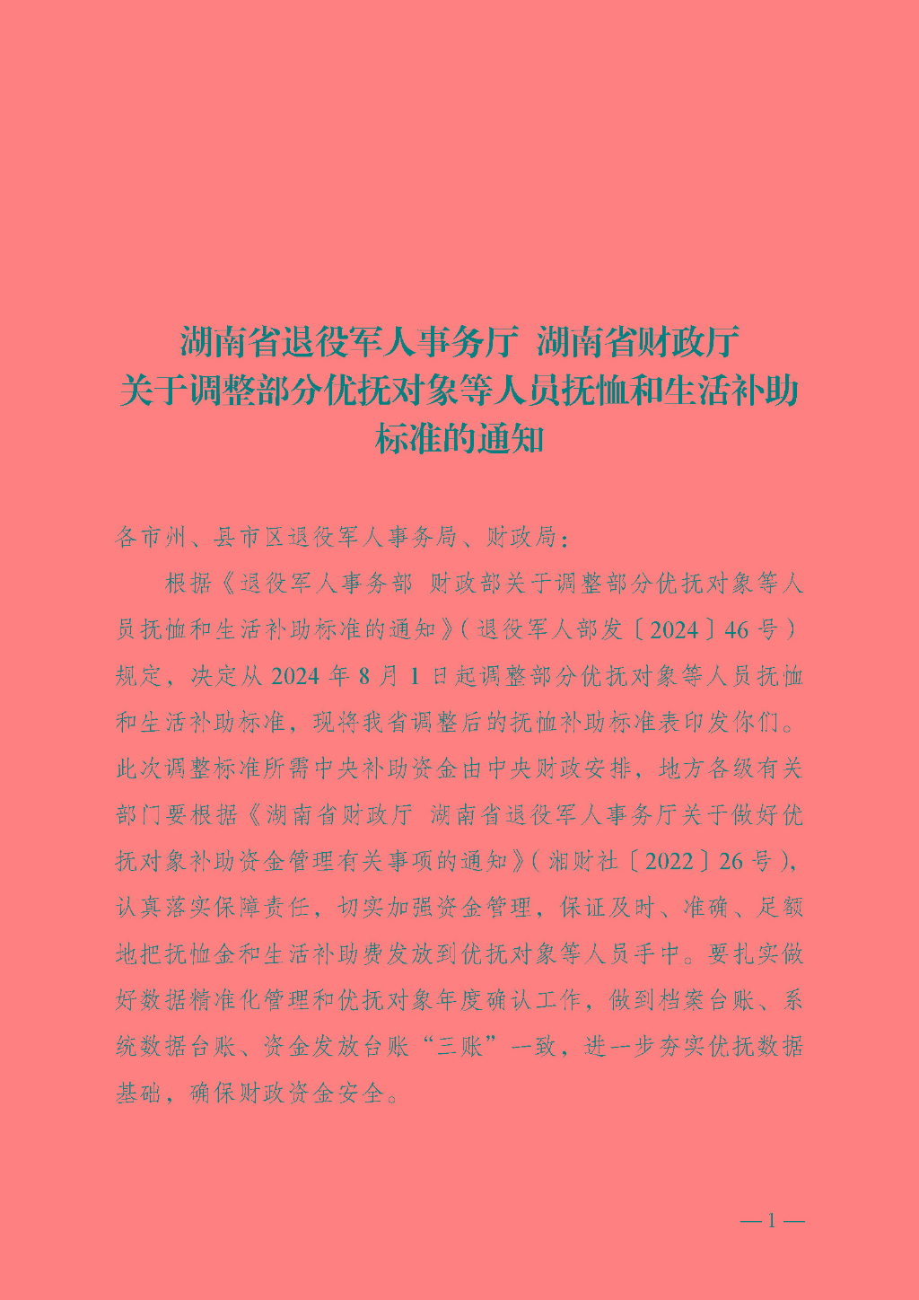 湖南省退役军人事务厅 湖南省财政厅关于调整部分优抚对象等人员抚恤和生活补助标准的通知